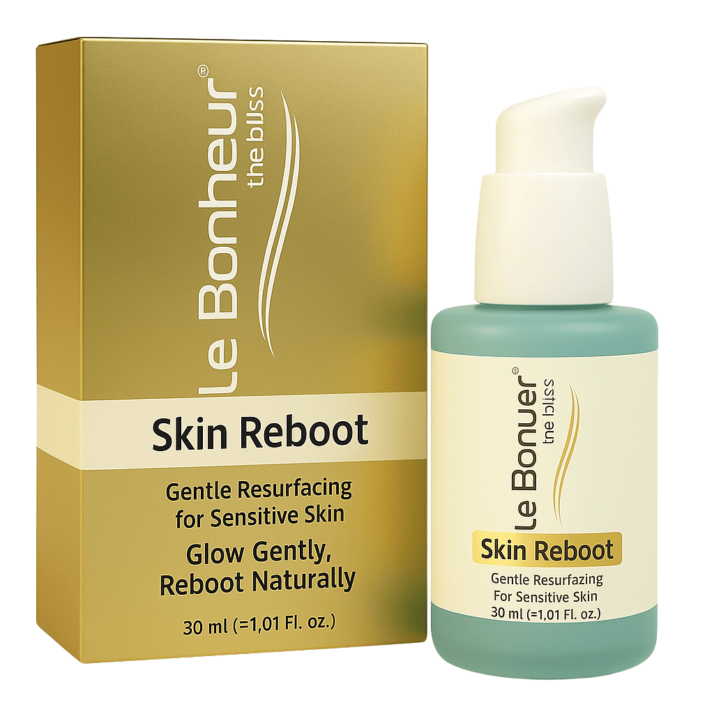 Le Bonheur Skin Reboot is a gentle resurfacing serum designed for sensitive skin. Infused with nourishing ingredients, it helps reduce skin dullness, refine texture, and promote a smoother, more radiant complexion. Perfect for daily use, this lightweight serum supports skin renewal, leaving your skin feeling refreshed, rejuvenated, and naturally glowing.